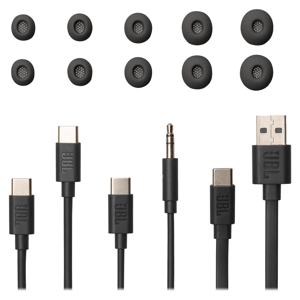- Includes: JBL Tour Pro 3 earbuds, Smart Charging Case, USB Type-C to Type C cable, USB Type-C to Analog 3.5mm cable, USB Type-C charging cable, 5 sizes of eartips + 1 x set of foam tips