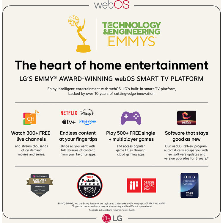 - WEBOS: No matter which TV you choose, your LG TV makes it easier than ever to find what you need and more. Browse all your favorite streaming apps and let LG Channels connect you to over 350 free channels and thousands of titles on demand¹