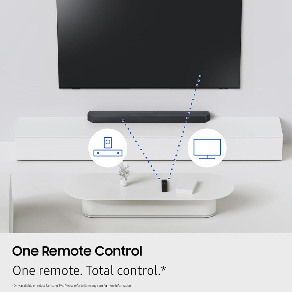 - ONE REMOTE. TOTAL CONTROL: Use your Samsung TV remote to control key soundbar functions, including power, volume and sound effects. You can access everything you need with the single remote. Enjoy full control and have one less thing to keep track of.*